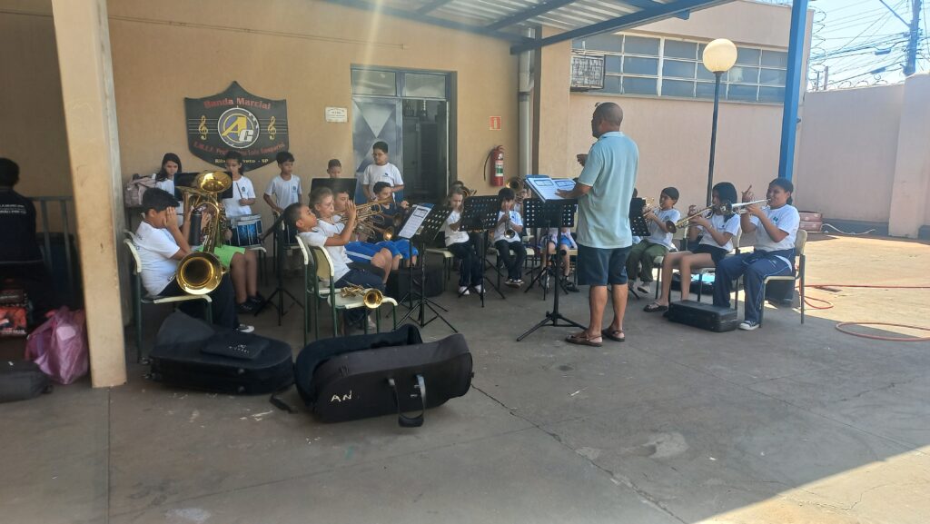 Recebemos a visita do músico e trompetista Michel Ramos – o Torão –, que compartilhou um pouco de sua técnica e habilidade musical com nossos integrantes da BMAG (Banda Marcial Alfeu Gasparini). Sua presença foi inspiradora e contribuiu muito para o crescimento artístico de nossos alunos. Agradecemos imensamente por essa troca tão enriquecedora!